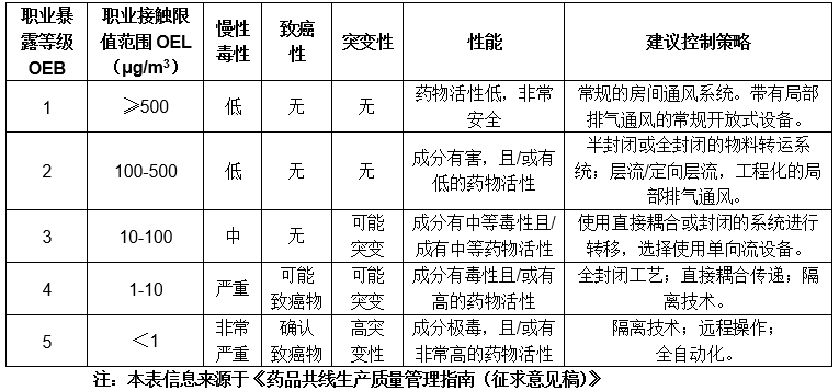 2021年11月12日,为指导和规范药品共线生产,NMPA核查中心组织研究起草并发布了《药品共线生产质量管理指南(征求意见稿)》。其中,在第四章提出:为了避免高毒高活产品在共线生产过程中产生交叉污染,可以考虑对于已有生产线和生产设备引入的新产品按照职业接触限值(OEL)进行分级,分级标准参见表1,对于不同毒性和活性的药品生产采取不同的控制措施。